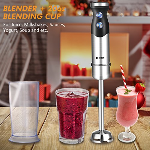 When using the hand blender to mix sauce or make milkshake, there will be no need to worry about splashing everywhere thanks to its splash-proof design and the large capacity blending cup which is 20oz/500ml.