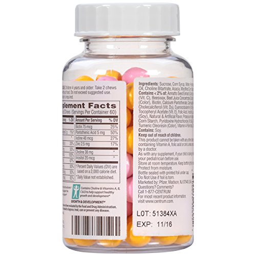 Centrum Flavor Burst Kids Chews are a uniquely delicious, chewable multivitamin for kids ages 4 and older. Great-tasting outside and chewy inside, Centrum Flavor Burst Kids provide essential vitamins and antioxidants: B-vitamins to help support daily energy needs*. Antioxidants, Vitamins C and E, help support the immune system* and key nutrients such as zinc to help support healthy growth and development*. Flavor Burst Kids Chews can be taken with or without water. Available in two great tasting varieties: Grape & Blue Raspberry and Tropical Burst.Feature