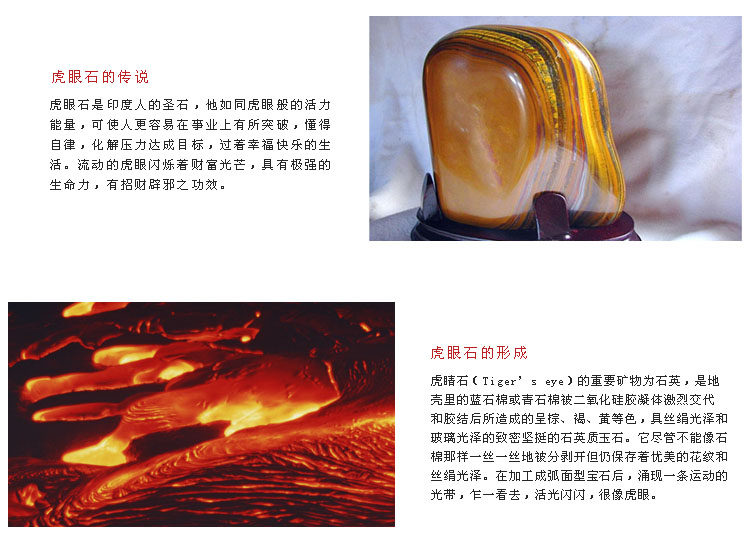 虎眼石是印度人的圣石,它如同虎眼般的活力能量,可使人更容易在事业上有所突破,懂得自律,化解压力达成目标,过着幸福快乐的生活。流动的虎眼闪烁着财富光芒,具有极强的生命力,有招财辟邪之功效