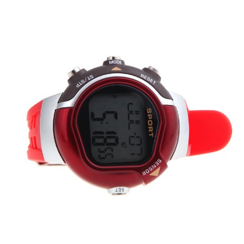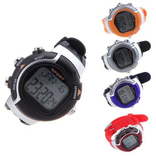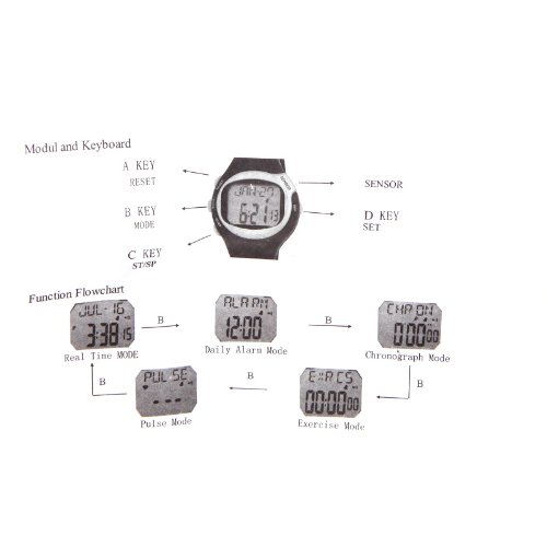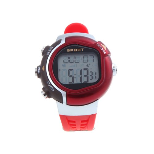 -. Feature : It can calculate your heart rate and calories burned while exercising. / Individual data is based on present age, weight, sex, and other surrounding environment. / Time and calendar. / Multifunctional design: 5 modes for your choice, real time, daily alarm, chronograph, pulse calculation, calories calculation. / Fashionable design ,mixed color collocation, irregular monitor.
