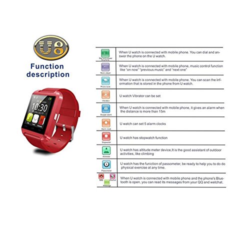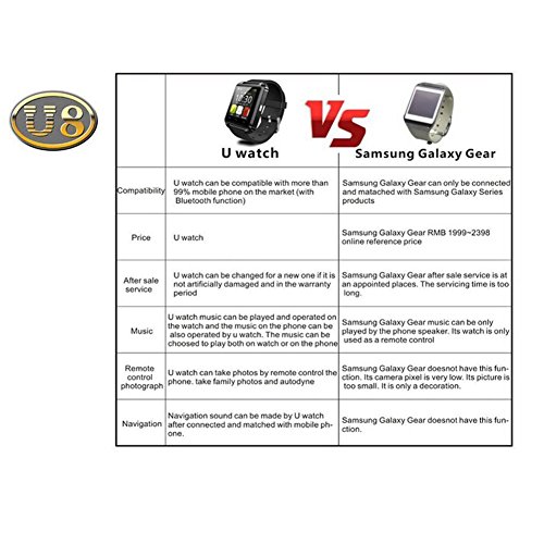 Bluetooth Watch U8. Compatible with Bluetooth V2.0 or higher smartphones, tablets and PCs (Android 2.3 or higher), such as Apple iOS smartphone iphone 4 / 4S / 5 / 5C / 5S / 6 Android Samsung S2 / S3 / S4 / Note 2 / Note 3 HTC Nokia, ect.