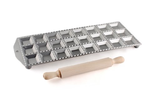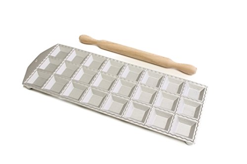 Studio : Paderno World Cuisine Publisher : Paderno World Cuisine Binding : Kitchen Product Description Making homemade ravioli is quick and easy with this Italian tool. Simply place a sheet of pasta over the mold, press a filling into each cavity and layer a secondary pasta sheet on top. Run the rolling pin across the mold to cut and seal each form. This mold is constructed of aluminum and the rolling pin is made of wood. The rubber feet on each corner help prevent slipping during use. Beechwood rolling pin measures 11 7/8". Makes 1 1/2" squares. 0