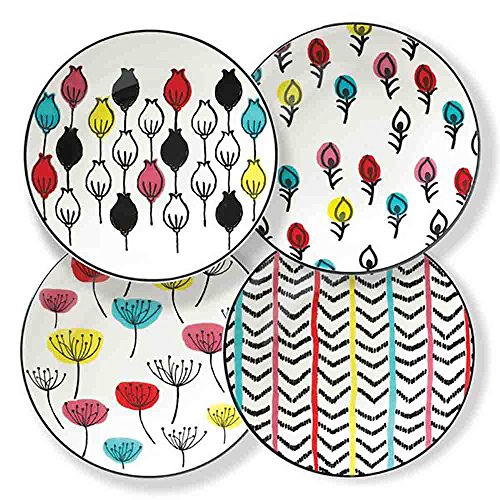 Studio : Lenox Publisher : Lenox Binding : Kitchen Product Description Designed with simple sophistication and clean lines, the around the table stripe 4-Piece dessert plate set is destined to create good times with friends and family. Crafted of creamy white stoneware and decorated with chalkboard black and bright Red, Yellow, Pink, and turquoise Stripes, this contemporary dinnerware is inviting and fun. Perfect for a casual get together and also makes a wonderful gift. 0