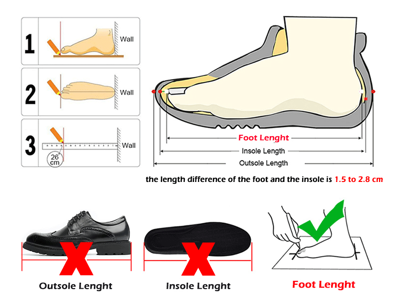 | Note: Dear buyer,Before buying,Please be sure to read the following table size, For Example:If you measure Heel to Toeis 26 cm,Please Choose size 42. | | Size Information | | Eur Size | 38 | 39 | 40 | 41 | 42 | 43 | 44 | | Heel to Toe (cm) | 24 cm | 24.5 cm | 25 cm | 25.5 cm | 26 cm | 26.5 cm | 27 cm | | If you have any questions, please contact me. | | | Contact Now | Contact Now | | Method of measurement | | According your bare foot length to confirm your size is the only correct way, Please do not choose the size according to the length of the insole. Please note that the insole must be longer than foot, the length difference of the foot and the insole is 1.5 to 2.8 cm |