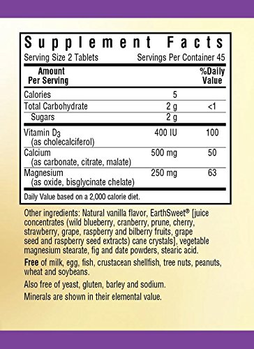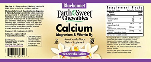Bluebonnet's EarthSweet® Chewables Calcium Magnesium & Vitamin D3 Tablets provide a blend of calcium, magnesium plus natural vitamin D3 (cholecalciferol) to support strong and healthy bones. This bone formula is naturally sweetened with EarthSweet®, a proprietary sweetening mix of juice concentrates (wild blueberry, cranberry, prune, cherry, strawberry, grape, raspberry and bilberry fruits, grape seed and raspberry seed extracts) and cane crystals. Available in naturally delicious easy-to-chew tablets for maximum assimilation and absorption.Feature