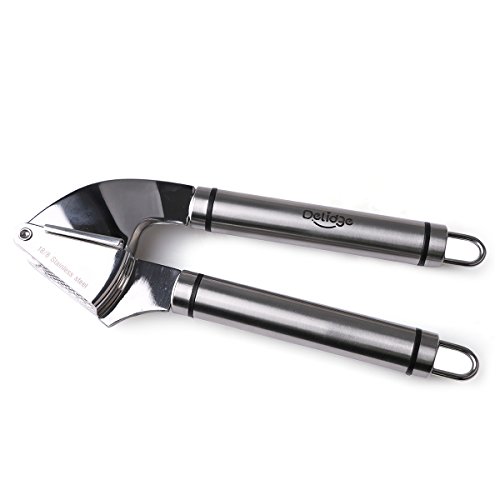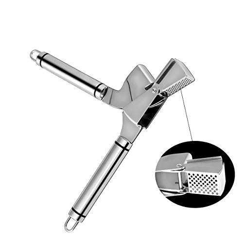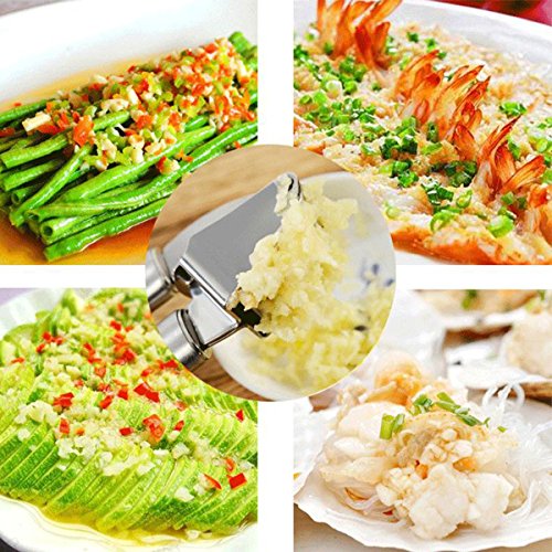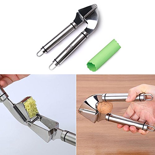 - 4.Garlic Press Mulitifunction:Press will be your favorite addition to your cooking arsenal for years. No more strength for you to cut garlic into small pieces, just to press it, garlic would become small smash, also can be used to open donuts