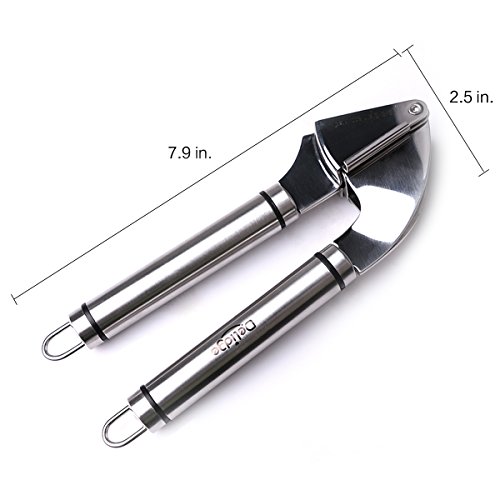 - 1.Stainless Steel Garlic Press Size and Design: 7.9x2.5x1.4 inches, Ergonomic design fits most hands and minces garlic and ginger with ease