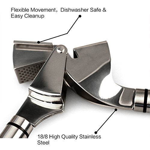 - 2.Garlic Press Material: Stainless Steel, the peeler tube from tough FDA approved silicone,Stainless steel garlic press won’t rust, weaken at the joints or break,Easy to Cleans up, just clean under running water or in the top rack of dishwasher