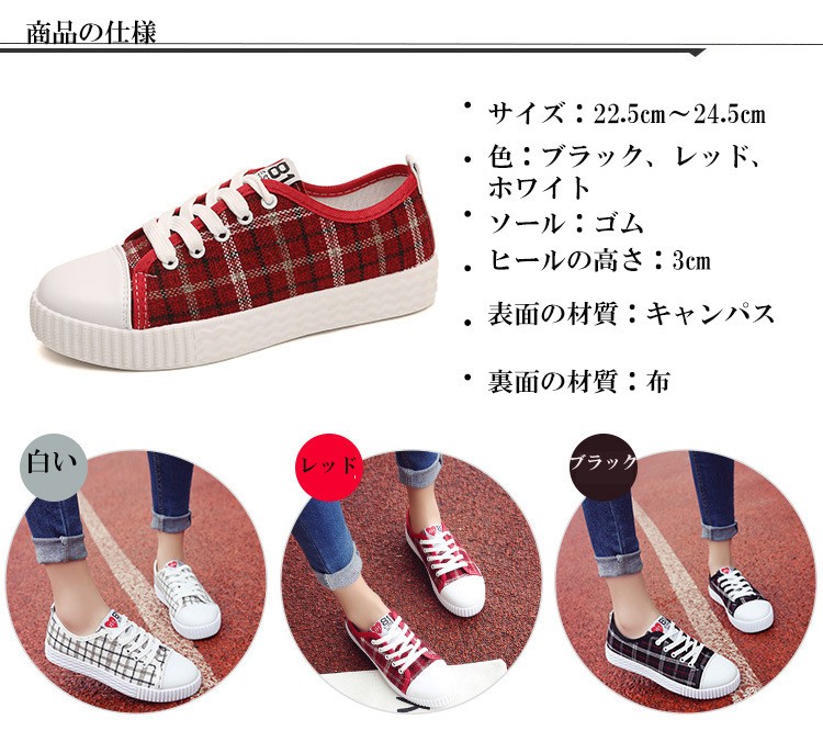 商品番号:XZ016材質:キャンパス+ゴム 裏面:布色:ブラック、ホワイト、純白いヒールの高さ:2cm約 アッパーの高さ:5cm約サイズについてEU36=22.5cm EU36=23cm EU37=23.5cm EU38=24cm EU39=24.5cm EU40=25cm注意:※ サイズなど、商品詳細を必ずご確認後、ご了承頂いた上でご購入をお願いします。また、採寸方法違いにより、0.5~1cmの誤差がございますので、ご了承ください。商品内容:1xスニーカー特徴:【軽量、通気性よい】ゴムのソールとキャンパスの材質でスポーツシューズならではの軽さを実現し、通気性もよいです。どんな季節でも着用します。 軽量なので、ランニングや歩くや他の運動が易くになりました。【ファッションな配色】ファッションな配色で、シューズがファッションになり、女性に最適です。中学生などに通学靴としてもよい選択です。 【ゴムのソール耐滑】柔らかい材質で作って、ゴムのソールので、耐滑のです。スムーズな足運びをサポートします。球技や他の運動にもスムーズになりました。【利用場合】スポーツだけでなく、通勤や通学やアウトドア、普段履きとしても カジュアルなコーディネートをお楽しみい ただけます。