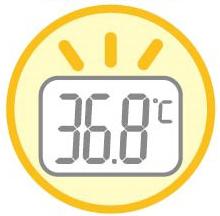 表示:体温計モード、温度計モード、メモリ機能、バッテリー残量少、度(単位)、エラー表示(L16、H40、Hi、Lo)