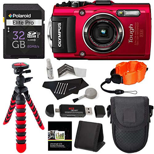 Olympus TG-4 16 MP Waterproof Digital Camera with 3-Inch LCD (Red) + Lexar 32GB Memory Card + 12" Tripod + Camera Case + Polaroid Floating Foam Strap + Cleaning Kit + Kit Accessory Bundle