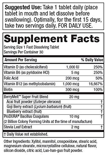 B12 Energy Probiotic Berry Melt is a quick dissolving, great tasting chewable supplement that promotes our well-being with essential B vitamins.* Vitamin B12 is a key energy vitamin. B12 is needed for metabolism of carbohydrates, which serve as the body's fuel.* Additionally, B12 builds proteins, strong red blood cells and healthy nerves.* Along with ProDURA, the "indestructible probiotic", B12 Energy Probiotic Berry Melt Formula includes the super fruits Acai and Goji Berry. This innovative Vitamin B12 formula is designed to give you a convenient, quick-dissolving mini-tablet. B12 Energy Probiotic Berry Melt fits easily in a purse or a pocket, making it perfect for people who need a vitamin B12 energy lift even when they're on the go.* Rounding out this innovative formulation, Vitamins B6, D3, Folic Acid and Biotin work as a nutritional team to help maintain healthy blood cells, strong bones and healthy brain function while supporting cellular energy production.* 0