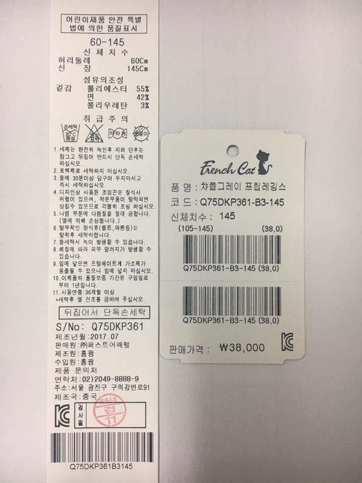 제품소재 : 겉감폴리에스터 55% 면42% 폴리우레탄3%