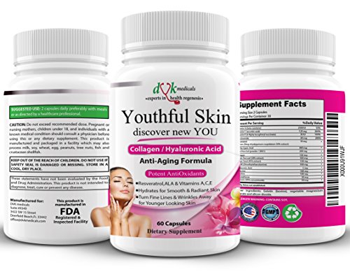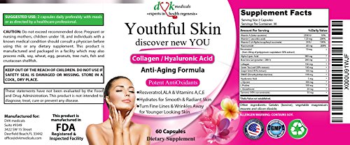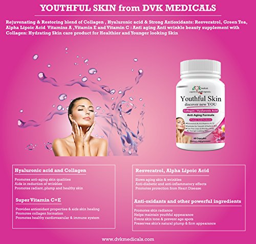 Studio : DVK Medicals Publisher : DVK Medicals Binding : Health and Beauty Product Description Why Youthful Skin New You? Some of our customers describe it as 'Youth in a Bottle'. It is a Unique, Safe Effective Dietary solution for natural, Healthy Regenerated and Hydrated skin! When you take the very first pill, as cells absorb these high potency combination nutrients and Vitamins -Healing process begins whether you have normal/dry/dull or ageing/combination skin. It only takes few weeks to rebuild youthful, luminous complexion. This is when most of our customers notice a dramatic difference in visual appearance of their skin - smooth, supple, radiant and youthful.... Wrinkles ,dark spots ,fines lines less visible.... Some of our customers say they are amazed that their skin looks decades younger. Getting compliments from family and Friends is very common- Imagine discovering New YOU. How is it possible by just taking a pill? High Potency Combination of Nutrients- Collagen- is the main naturally occurring ant wrinkle protein in the dermis layer of skin. Along with Hyaluronic acid, it nourishes the skin to significantly slow down the ageing process, help regain lost elasticity and tone. Hyaluronic acid is often called 'the Fountain of Youth' Strong Antioxidants - Resveratrol, Green Tea, ALA ,Vitamin E ,Vitamin A Vitamin C - with their anti inflammatory properties, promote healing and maintain youthful elasticity of skin tissues to refresh and renew your skin. They nourish the skin to significantly slow down the ageing process thus create a youthful feeling as well as look. Also fight damage by Free radicals that cause premature aging and bring back your skin health and beauty.... Improved structural integrity of the skin in as little as few weeks to restore youthful, plump skin.Try out this Exceptional value product today Risk Free- If you are not 100 % satisfied for any reason, we'll happily give you full refund. 0 |