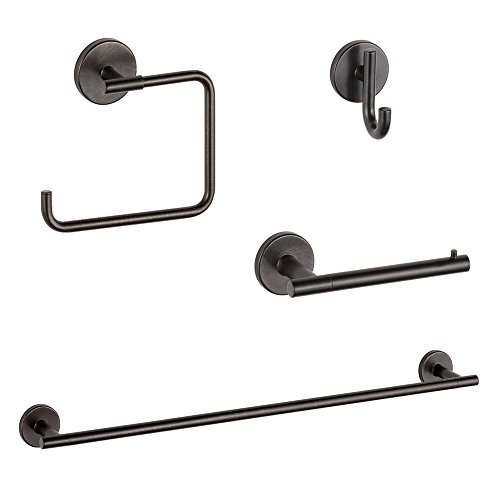 - Kit includes 24-in towel bar, robe hook, towel ring, and toilet paper holder
