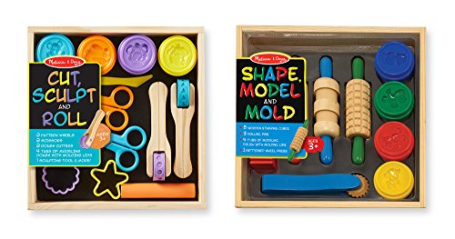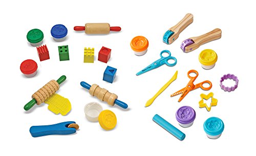 Let the good times roll! Featuring exciting tools and vibrantly colored modeling dough, these two sets invite children to cut different shapes with zigzag and straight scissors, sculpt circles and triangles with pattern wheels and patterned rolling pins, and mold adorable figures by turning over the covered tubs and pressing. Each set comes with four tubs of dough (red, yellow, blue, and green in one and purple, orange, yellow, and blue in the other) with different patterns on all the lids. There are eight sculpting tools in one set and nine in the other for endless way to sculpt, shape, mold, and more!.Feature