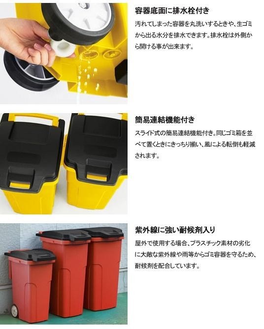 | 素材・材質 | 本体・フタ・フタロック・ポリ袋止め・ホイール・ハンドル:PP 排水栓・重りカバー:PE フタパッキン:発泡PE 車輪軸・ストッパー・ネジ・ワッシャー・重り:鋼(スチール) タイヤ:エラストマー 前輪キャスター:ナイロン |