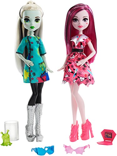 Spark imaginations with this Monster High two-pack of dolls -- Frankie Stein doll and Draculaura doll are ready for science class! the two beasties have goggles, a laptop and an experiment designed to create some fun. You decide when to let the little green monster out of its jar -- he's so aaah-dorable, you might keep him as a class pet! each 12-inch doll has on a gore-geous science-themed outfit that earns an "a" inside or outside the classroom. Favorite colors, signature style and iconic elements are fangtastic. Put the goggles on these young scientists and discover all kinds of fun! includes Frankie Stein doll and Draculaura doll wearing fashions and accessories, two pairs of goggles, one laptop, one jar and one monster. Dolls cannot stand alone. Colors and decorations may vary.Feature