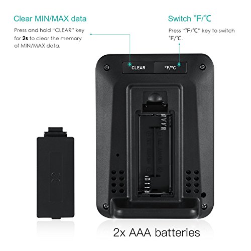 • MIN/MAX display - Temperature and humidity will update timely, meanwhile the data will automatically be cleared each 24 hour after power on. Or you can press and hold "CLEAR" button for 2 seconds to clear the memory of MIN/MAX data.