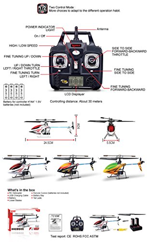 - Feature : Size: 24.5cm*5.5cm*9cm / Color:orange / Charging time: about 60 minutes(USB charging) / Flying time:About 6 munutes above / Double Protection: Helicopter flys more safety,as it will be power-off automaticlly when chocked