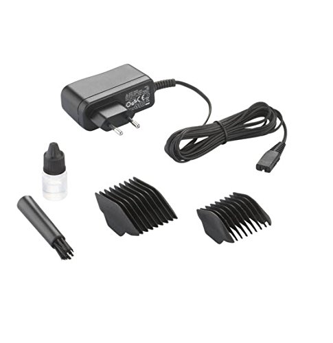 -. Feature : MAGIC BLADE: Professional stainless steel blade set. Powerful cutting thanks to high-precision grinding technology 0.7mm "Made in Germany". / QUICK CHANGE: Quick-release blade set. Optional fine contour blade set available. / LOW NOISE: Super light and quiet. Wrist-friendly weight of only 140 g. / INCLUSIVE: 2 reversible attachment combs 3/6 and 9/12 mm, energy-efficient plug-in transformer, cleaning brush, oil. / CLEVER: LED charge indicator, Dual Voltage 100-240V - EU Socket + Free US Plug Adapter