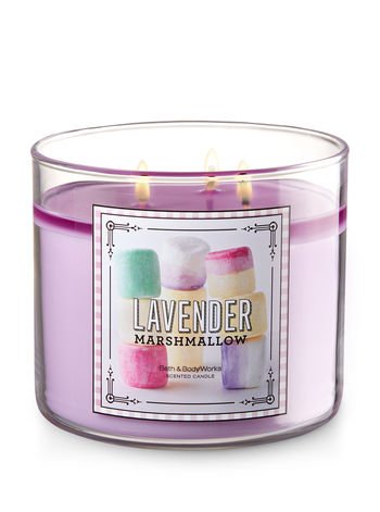 -. Binding : Kitchen -. Brand : Bath & Body Works -. Color : Purple -. EAN : 0795525289794 -. Feature : The merging of two unexpected flavors, Lavender and Marshmallow, make this mouthwatering blend a special treat / Burns approximately 25 - 45 hours / Topped with a flame-extinguishing lid / Measures 4" wide x 3 1/2" tall -. Label : Bath and Body Works -. Manufacturer : Bath and Body Works -. ProductGroup : Home -. ProductTypeName : HOME -. Publisher : Bath and Body Works -. Studio : Bath and Body Works -. Title : Bath and Body Works Lavender Marshmallow 3 Wick 14.5 oz Candle -. UPC : 795525289794