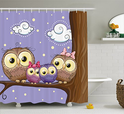 Kids Decor Shower Curtain by Ambesonne, Cartoon Style Owl Family Mother Father Daughter Son Sitting on a Branch, Fabric Bathroom Decor Set with Hooks, 70 Inches, Brown and Lavander