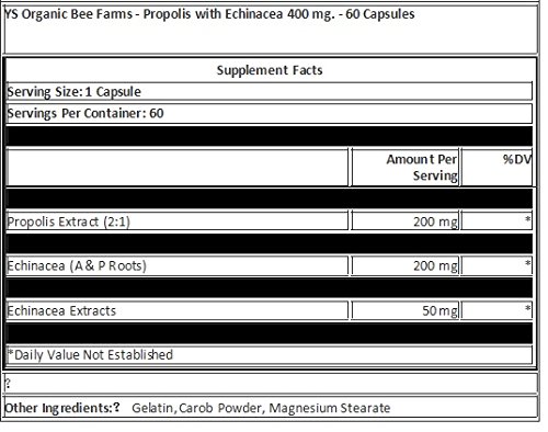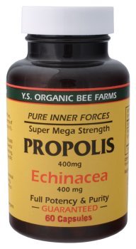 Studio : YS Organic Bee Farms Publisher : YS Organic Bee Farms Binding : Health and Beauty Product Description Description Pure Inner Forces Super Mega Strength Full Potency Purity Guaranteed Pioneer in Organic Recent Medical Data has shown Propolis has Multi Beneficial Properties; Powerful Antioxidant, Immune System Enhancing, Anti-Inflammatory, etc. Write for specific Medical Data desired. Y.S Beekeepers of generations are serious about Certified Organic Bee Farming, researching and leading the world to Organic. Suggested Use 2-4 capsules per day. Other Ingredients Gelatin, carob powder, magnesium stearate. Free of sugar, caffeine, common allergens Each Capsule Contains: 400 mg Potency (2:1 Strength) of Pure, Natural State Propolis, 400 mg Potency of Echinacea A. P. Roots Plus Extract (4:1). 0