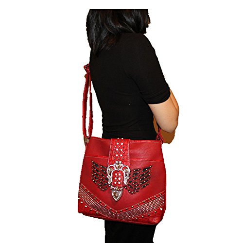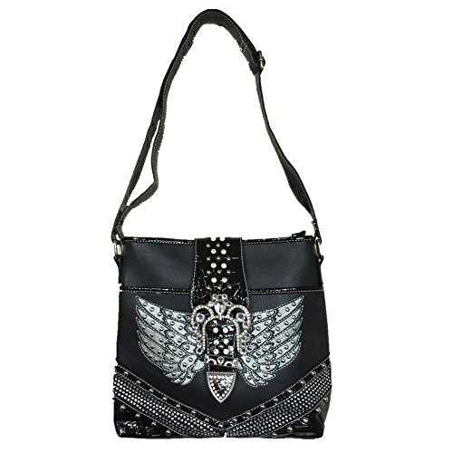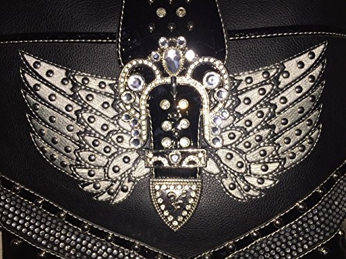Product Description Rhinestone Studded Angel Wings Buckle Stlyle Leather Messenger Bag, Wallet in Black. High quality PU Leather, stylish angle wings design with buckle closure on top. Messenger bag with compartments inside, cellphone pocket, wallet pocket. Large pocket with zippers inside, on top and outside, extra pocket on back for everything easy to get.. Size: 11" x11" x2"; Weight: about 1.2lbs.Detailed rhinestone angle wings design. backup rhinestone included.fast handling and shipping in same business day.Matching wallet is available by searching in our Amazon store. 0