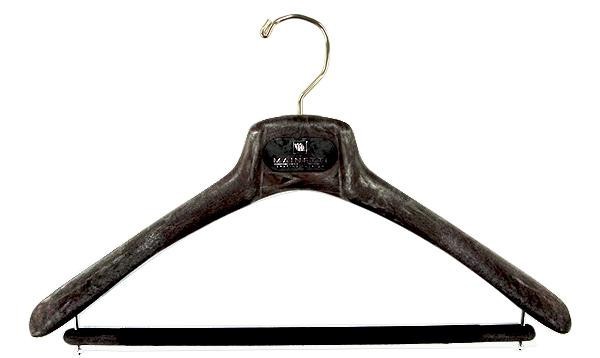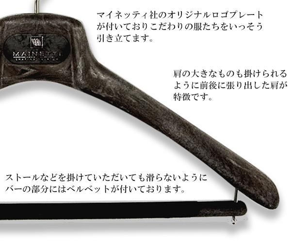 メンズハンガーとほぼ同じ形ですが、肩先(両端)を太くしたコートハンガー。コートのような肩の大きなものも掛けられるように前後に張り出した肩が特徴です。お好みでジャケットを掛けることもでき、バーの部分にはストールなどを掛けることもできます。 |