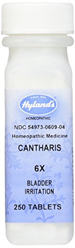 Hyland's Cantharis 6X Tablets, Natural Homeopathic Relief of Bladder Irritation or Minor Sunburn, 250 Count Bladder Irritation or Minor Sunburn NATURAL REMEDIES SINCE 1903? Hyland’s has been producing homeopathic medicines since 1903. Made with natural ingredients and made in the United States. Hyland’s products contain no artificial flavors, dyes or parabens. This product works to stimulate the body’s own natural healing process. FDA COMPLIANT MANUFACURING Always read and follow the label directions when using Hyland's products. The uses for our products are based on traditional homeopathic practice. Hyland’s products follow the manufacturing and quality practices outlined in the Homeopathic Pharmacopoeia of the United States. Hyland’s operates in full compliance with the FDA standards for manufacturing, safety and labeling. Hyland's products have not been reviewed by the Food and Drug Administration. All ingredients are tested upon receipt to ensure potency and safety. Hyland’s Facilities use the most up-to-date equipment and environment to guarantee purity and quality. SAFE AND RELIABLE Homeopathy is a safe effective system of medicine with fundamental principles for selection, application and manufacture. Homeopathy’s potency preparations (6X, 30X, 30C) make dosing safe and stimulating to the body’s own healing properties. Hyland’s quick-dissolving sublingual tablets are safe, effective and completely free of Aspirin, Acetaminophen or Ibuprofen. Homeopathic preparations dilute and invigorate the source, making doses non-toxic and safe to take alongside other medications without contraindications or known side effects. 0 |
