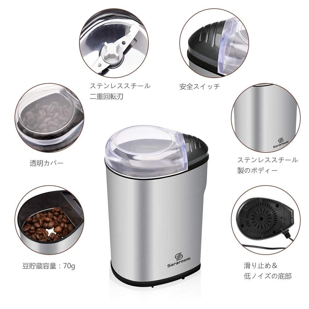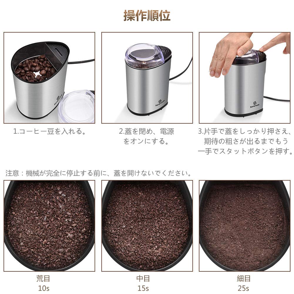 【多機能】コーヒーミル1台でコーヒー豆だけではなく、ナットや米、干した薬材および香料などでも粉砕可能なので、ニーズに応じて様々なお料理に活用できます。また、安全スイッチつきで、安全に使えます。