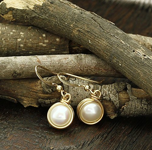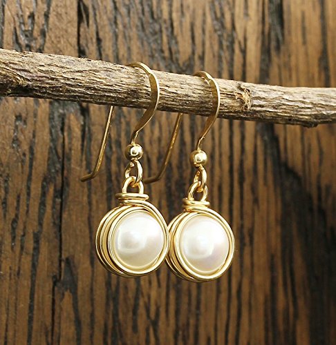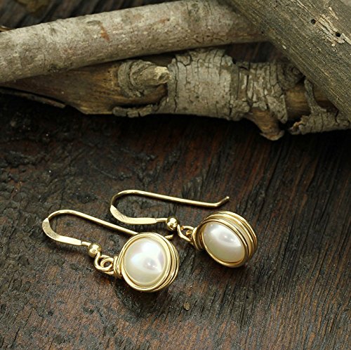 14k Gold Filled dangle earrings with freshwater white cultured Pearls. Attached to the hook is an exquisite 8 mm freshwater cultured Pearl hand wrapped with 14k Gold Filled wire.