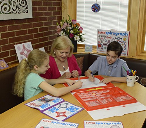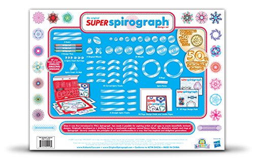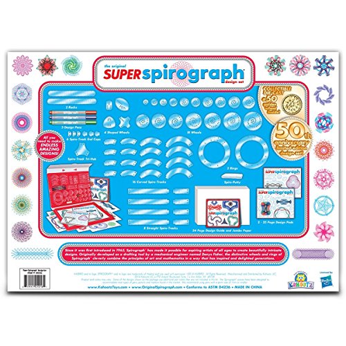 - Feature : Kahootz-Spirograph super kit / It is an imported item / Recommended for ages 8 and up / Conforms to ASTM d 4236 / You'll have super fun with the Super Spirograph Kit, which comes with twice as many gears as the original Spirograph / A gold-colored metal 50th anniversary commemorative Spirograph gear is included in the kit / Comes with unique arcs that snap together to form a variety of curves, to make even more spiro-tastic designs / Also includes Spiro-putty, 3 pens, 2 pads of paper and instructions / Inspired by the original 1965 Spirograph, and brought to you by Kahootz Toys