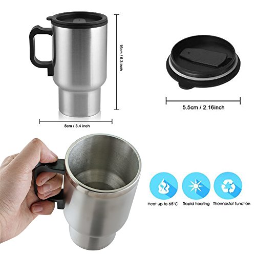 【KEEPING CONSTANT TEMPERATURE】This stainless steel cup plugs into your car's cigarette lighter and maintains a temperature of 60°C - keeping your tea or coffee warm and drinkable while you're on the travel. Ergonomically designed, fit most vehicle cup holders. Portable travel car heating water, coffee, milk, eggs, tea, also as a baby warmer.