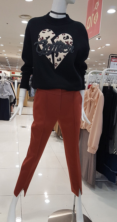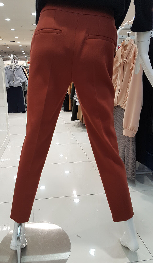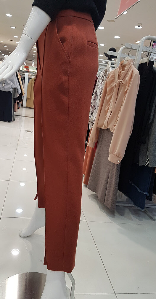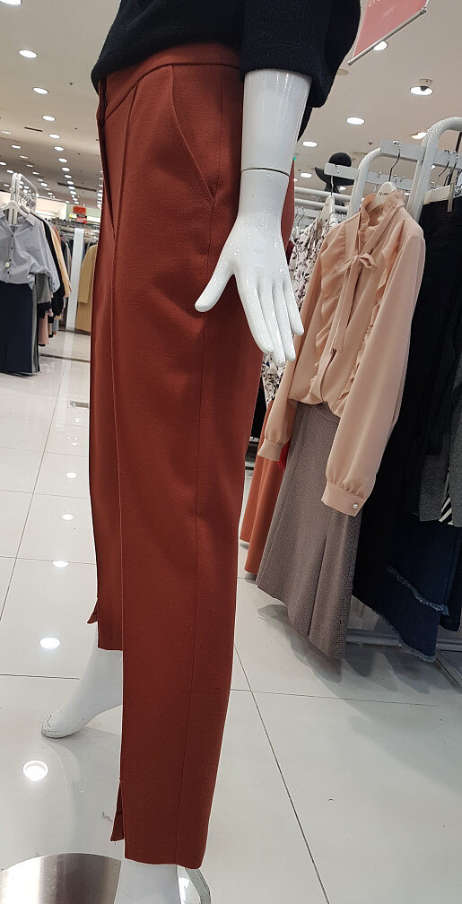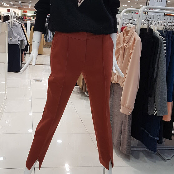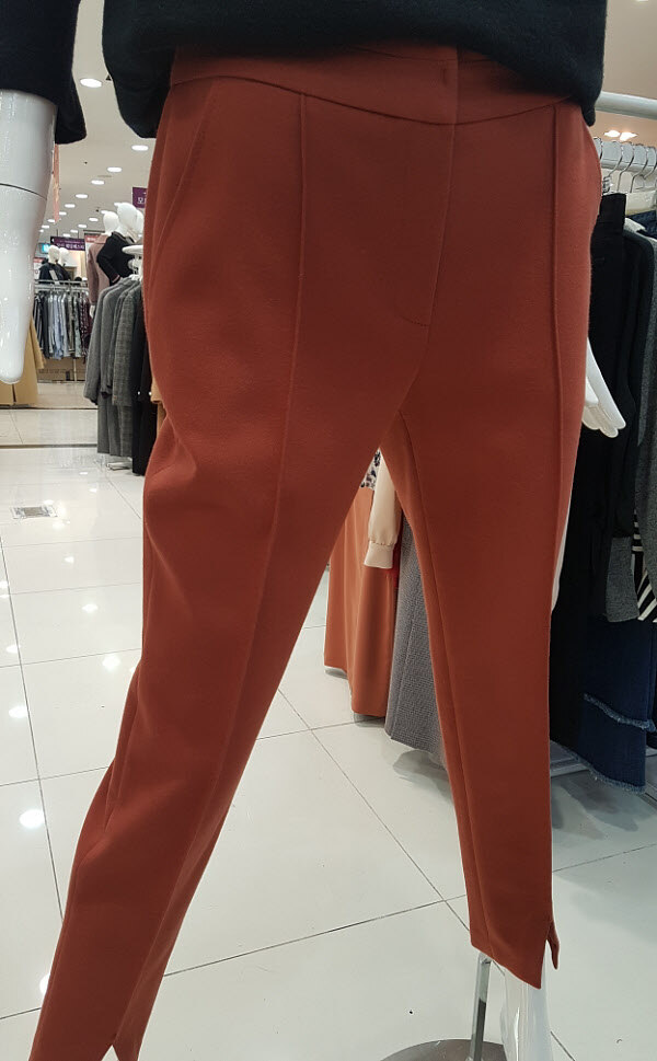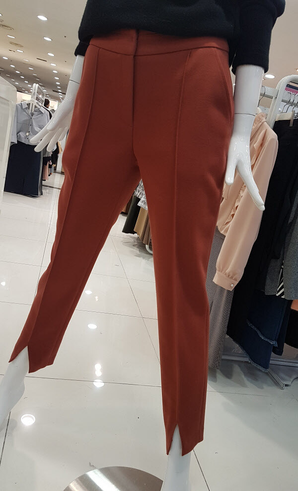 이쁜 브라운컬러에 날씬핏 아이랍니당 앞트임에 슬림핏은 다리가 롱하구요두께감있어 쭉~ 활용 좋으실듯 합니다^^