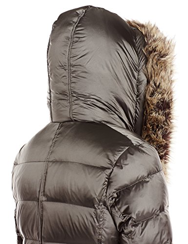 Quilted down coat featuring asymmetric front zipper and hood trimmed in faux fur