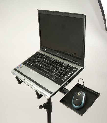 -. Feature : Free-standing tripod laptop holder / All-Steel construction / Four stoppers, adjustable in width and depth, will securely anchor any size laptop, without interfering with input/output ports, expansion slots, cd-rw/dvd drivers, A/C adapter sockets placed on either side of the laptop / The laptop tray is height, and swivels at 360 degrees to allow for ideal positioning of the laptop / Equipped with pull-out mouse tray, that can be positioned on either the left or right side of the laptop, and is retractable for easy storage and transport