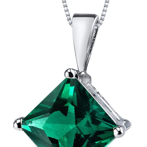 Gemstone: Lab Created Emerald, Princess Cut, 8 mm, 2.2 carats, Rich Forest Green Hue with Brilliant Sparkle. Pendant: 0.97 grams pure 14k White Gold with 14k stamp. Pendant feature exceptional Design, Craftsmanship and finishing. Perfect gift for Mothers Day, Birthdays, Valentines Day, Graduation, Christmas or just about any other occasion. Money Back Guarantee. Includes a Signature Gift Box. Includes matching 18 inch Sterling Silver Rhodium Finish Box Style Chain. Style P9134Feature