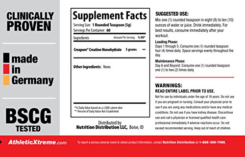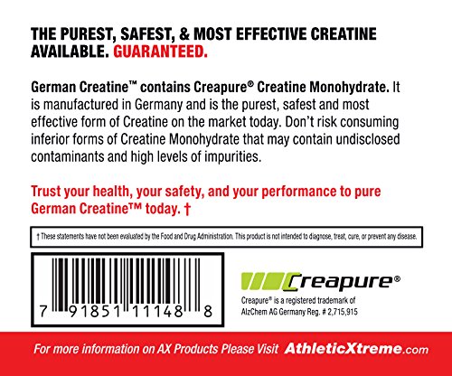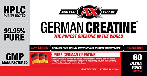 -. Feature : German Creatine is the purest, safest and most effective form of Creatine on the market today. / German Creatine is made with 100% Creapure Creatine Monohydrate, manufactured in Germany under strict GMP conditions, and verified for purity using High Pressure Liquid Chromatography. The end result is the highest purity level for Creatine Monohydrate ever achieved in the world - a minimum 99.95%. / Trust your health, your safety, and your performance to pure German Creatine today. / Nothing has stood the test of time and research better than Creatine Monohydrate. German Creatine is superior to all other Creatine products on the market, including Creatine Ethyl Ester and Creatine HCL. / German Creatine, made with Creapure Creatine Monohydrate, is produced by AlzChem Trostberg GmbH in Germany under the strictest quality control standards. Clinically Proven. WNBF Approved. BSCG Tested. HPLC Purity Tested. 99.95% Pure. GMP Manufactured. Mixes perfectly with juice to create creatine grape, creatine watermelon or any other flavor of your choice.