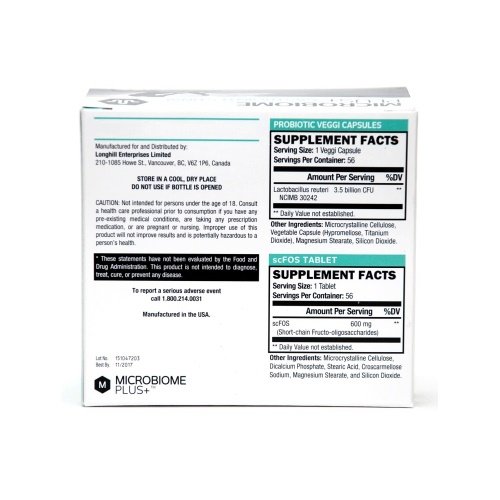 Microbiome Plus+ Gastrointestinal probiotics is a more complete gastrointestinal health dietary supplement that provides natural prebiotic fiber (scFOS) and the probiotic L. reuteri NCIMB 30242 which work together to maintain the balance of healthy bacteria in your gut and support normal digestive function.* The probiotic in Microbiome Plus+ Gastrointestinal has been shown to lower bad (LDL) cholesterol, support normal inflammatory response and digestive health.* (scFOS) is a natural prebiotic fiber that supports a healthy gastrointestinal tract by promoting digestive function, immune health, the growth of healthy bacteria, natural intestinal mechanical barriers, and gut integrity.* Microbiome Plus+ Gastrointestinal combines these two ingredients to provide more complete gastrointestinal health support.* Not only does scFOS support digestive function but as a prebiotic helps L. reuteri NCIMB 30242 to support normal gastrointestinal function.*
