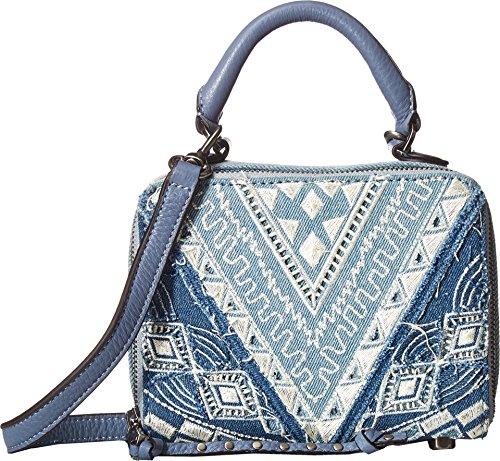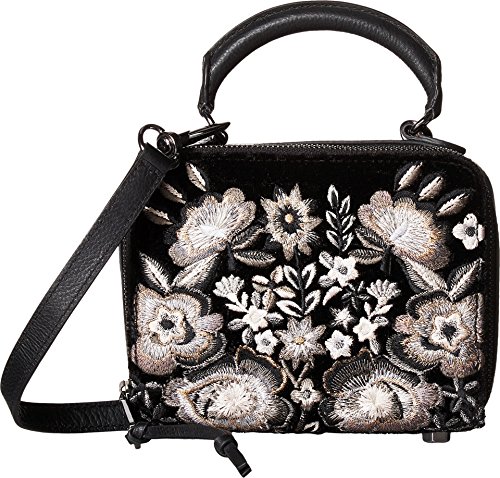 A nubuck Rebecca Minkoff cross-body bag with a boxy silhouette and crystal-studded accents. Wraparound zip and lined, 1-pocket interior. Rolled handle and optional, adjustable shoulder strap.