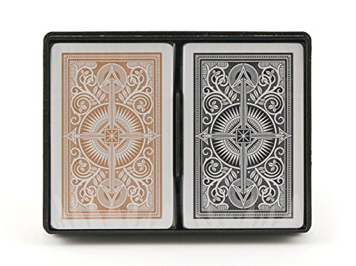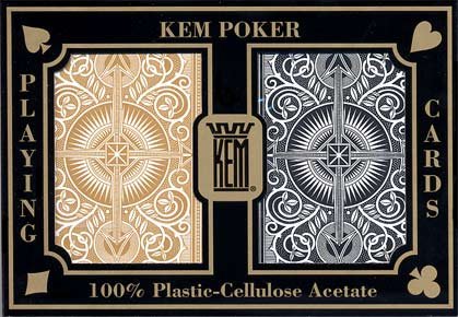 Amazon.com These playing cards from KEM are made of 100 percent cellulose acetate plastic--a unique blend of paper and plastic that provides superior flexibility and strength. The cards are scuff- and break-resistant and completely washable, and are designed to deliver the classic snap and feel of paper with the exceptional durability of plastic. Included in this set are two decks (one black, one gold) of poker-sized playing cards (3 1/2 inches by 2 1/2 inches). The cards come with a durable storage case made of hard plastic. Each deck contains one joker. About KEM Plastic Playing Cards KEM Plastic Playing Cards is a 60-year-old company specializing in one product: playing cards that are 100 percent cellulose acetate plastic. KEM plastic playing cards contain no vinyl, which is the raw material used by other playing card manufacturers for their "plastic" playing cards. KEM cards can handle the wear and tear like no other brand of card in the industry. KEM's high-performance cards are designed to last longer, shuffle better, and deal in such a manner that you will never want to play with other cards again. 0