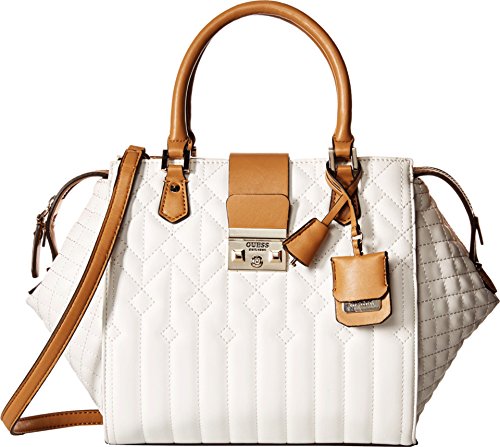 Top-zip closure with brand logo magnetic snap closure flap. Dual rolled handles with detailed key-chain tag. Adjustable shoulder strap. Exterior flaunts a quilted stitch design with back zip-closure. Interior features zip-pocket and multiple slip pockets. Flat-base. Lining: 80% polyester, 20% cotton. Imported.