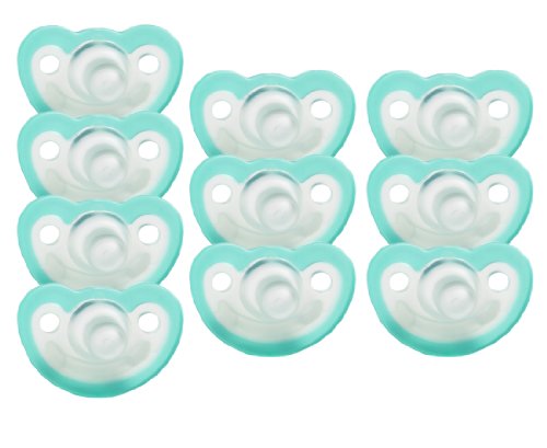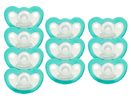 -. Feature : Natural shape, textured nipple babies love; Easy-to-hold loop shaped handle with teething nubs / Soft & flexible - no hard inner guard; Comfortable, curved shape fits baby's face / Safe 100% silicone - won't crack, break or peel / Two-tone baby bright colors / Phthalate-free, latex-free, BPA-free, DEHP-free; This includes: 10 Pacifiers -Vanilla Scented, Sealed in a polybag