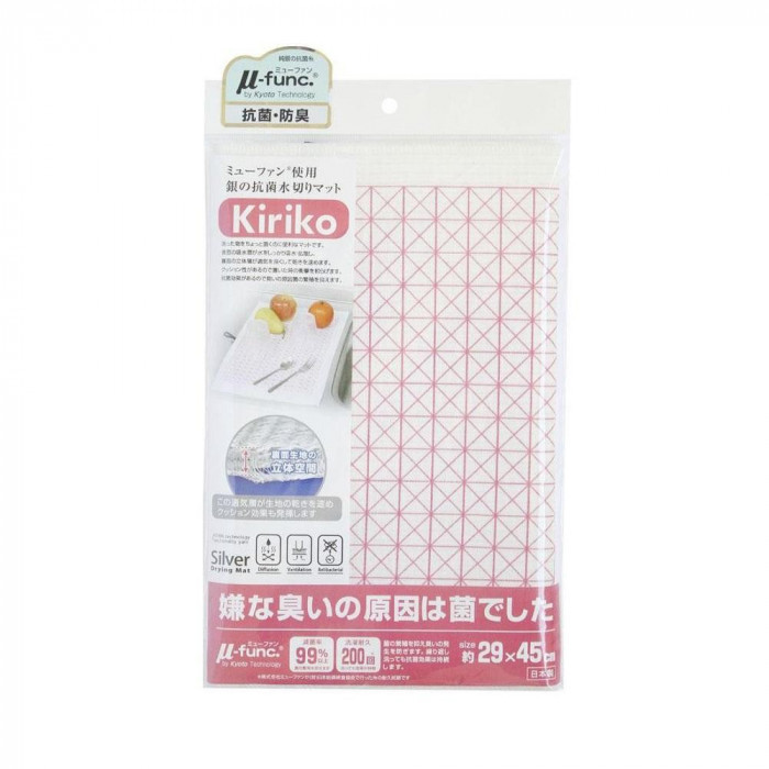 食器乾燥機に入らないお鍋や、ちょっとした洗い物のときに大活躍!表のマイクロファイバー生地で水分をサッと吸水します。メッシュ状なので通気性もよく、乾燥が早いので衛生的です。また裏面生地にはクッション性があるので食器を置いたときの衝撃も和らげてくれます。純銀の抗菌糸「ミューファン(R)」を使用しており、純銀から放出される銀イオンが菌の繁殖を抑え、臭いの発生を防ぎ衛生的にお使い頂けます。 |