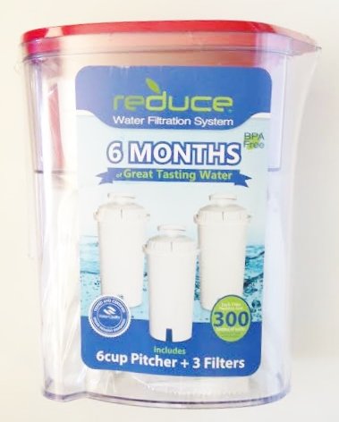 -. Binding : Kitchen -. Brand : Reduce Water Filters -. Color : Red -. EAN : 6357381631748 -. Feature : 1 Large RED Pitcher + 3 Water Filters / Sleek Design / Capacity: 6 Cups (Measures 8.75" Tall) / 6 Months of Great Tasting Water / Each Filter Replaces Up to 300 Bottles of Water -. IsAutographed : 0 -. Label : Reduce -. Manufacturer : Reduce -. PackageQuantity : 1 -. ProductGroup : Home -. ProductTypeName : HOME -. Publisher : Reduce -. Studio : Reduce -. Title : Reduce 6 Cup Water Filter Pitcher + 3 Filters - Red
