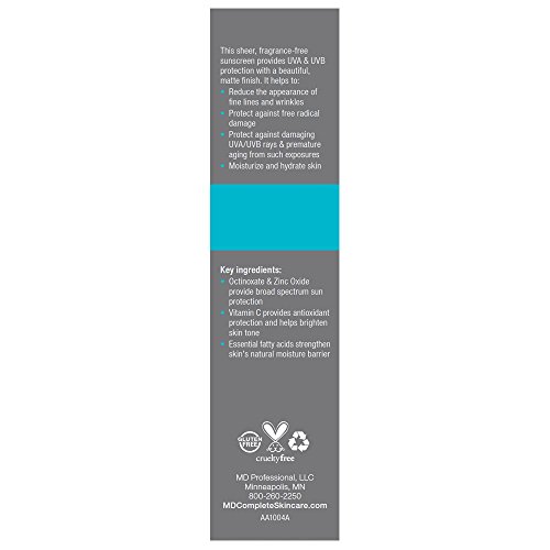 This sheer, fragrance-free sunscreen combines UVB and UVA protection with a beautiful, matte finish. It helps to reduce the appearance of fine lines and wrinkles, protect against free radical damage, protect against premature aging from sun exposure, and hydrate your skin. Active sunscreen ingredients include: Octinoxate 7.5%, Zinc Oxide 10.5%. Vitamin C provides antioxidant protection and helps brighten skin tone. A potent mix of Essential Fatty Acids strengthen skin's natural moisture barrier while also hydrating and softening the skin. A blend of Vitamin E, Citric Acid, Squalane, and CoQ10 provide additional antioxidant protection.Feature