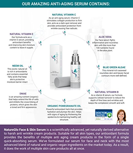-. Feature : ADDRESS MULTIPLE SIGNS OF AGING WITH A SINGLE SKIN SERUM - Our anti-aging serum softens fine lines, acts as a dark spot remover to reduce hyperpigmentation and firms skin to reduce sagging simultaneously and promote a more youthful complexion / THE ONLY FACE CARE FORMULA YOU NEED - Why apply a separate vitamin C serum, vitamin E serum and anti wrinkle cream when one single skin serum can do it all? This moisturizing, age-fighting formula will simplify your skin care regimen / MADE IN USA FROM THE FINEST INGREDIENTS NATURE HAS TO OFFER - This vitamin C serum uses aloe vera, neem oil, blue green algae and other natural, vegan ingredients to deliver results! We're also Cruelty & Gluten Free! / ULTRA GENTLE - Although our serum for face and neck is maximally effective it's free of harsh ingredients that can damage skin and worsen imperfections! It's even a gluten free face serum safe for those with dietary sensitivities / SATISFACTION GUARANTEED - We use only scientifically proven natural ingredients in our anti-aging cream to make it the absolute best anti aging serum on Amazon. If you don't love our face serum, just let us know and we will give you a full refund.