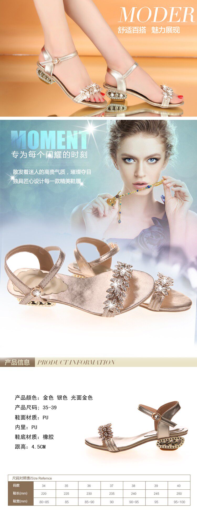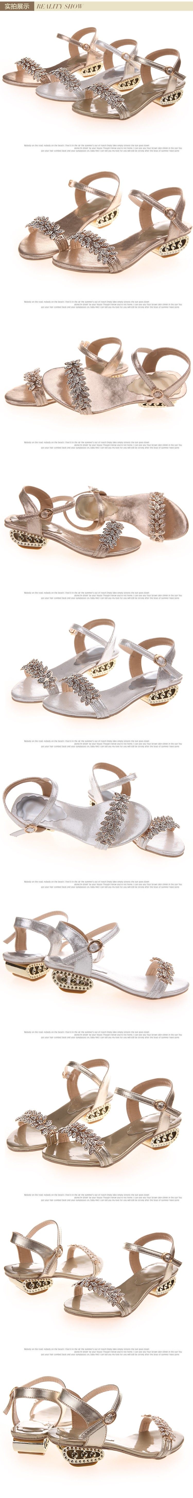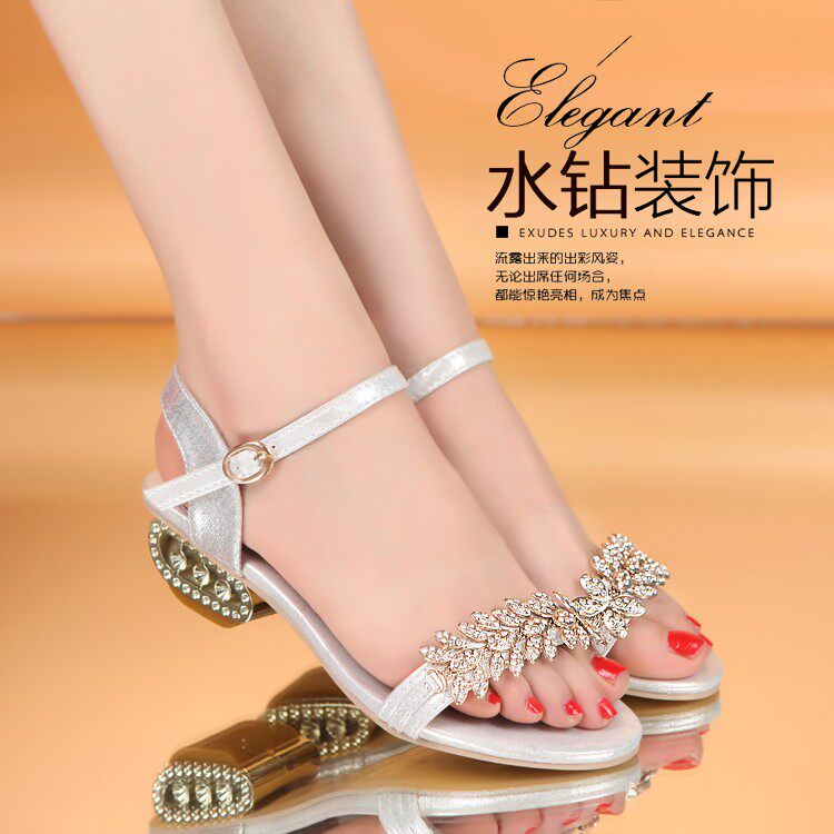 夏季新款时尚露趾中跟坡跟凉鞋女水钻韩版一字扣带凉鞋 女